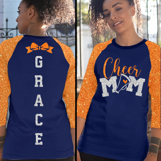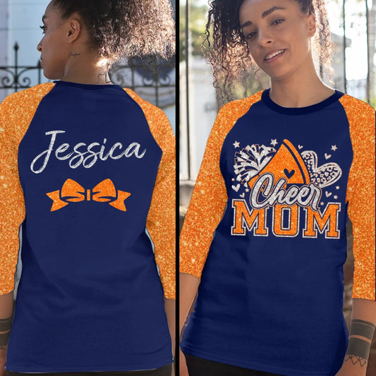 Personalized Glitter Cheer Mom 3/4 Sleeve Raglan T-Shirt for Cheer Mom