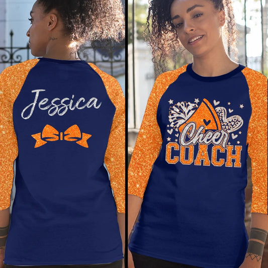 Personalized Glitter Cheer Coach 3/4 Sleeve Raglan T-Shirt