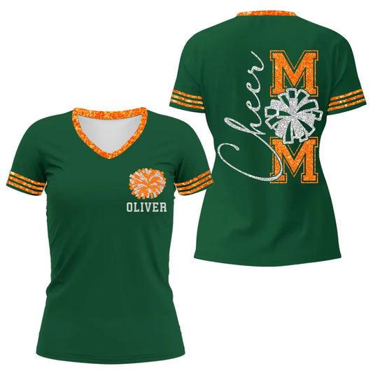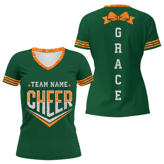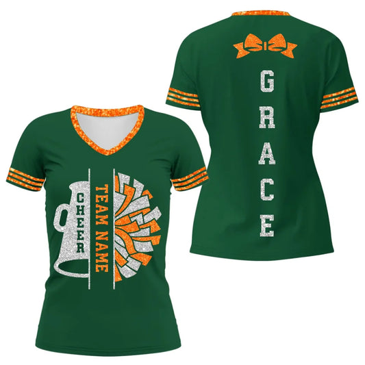 Personalized Glitter Cheer Cheerleader Team Printed V-Neck T-Shirt