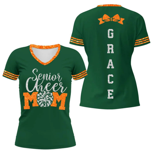 Personalized Glitter Senior Cheer Mom Printed V-Neck T-Shirt