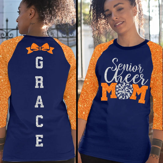 Personalized Glitter Senior Cheer Mom 3/4 Sleeve Raglan T-Shirt