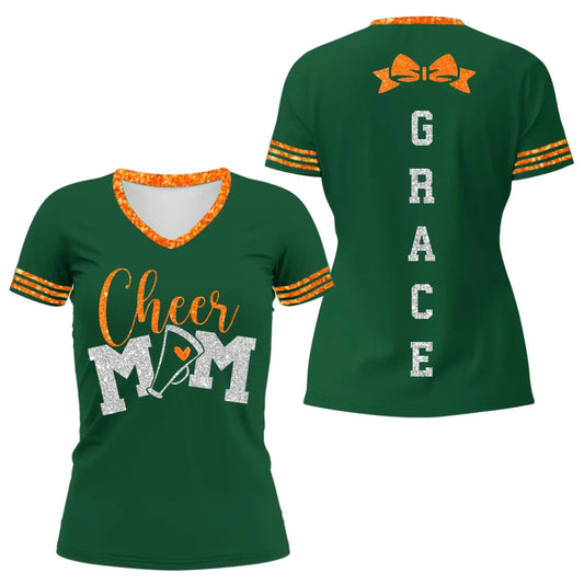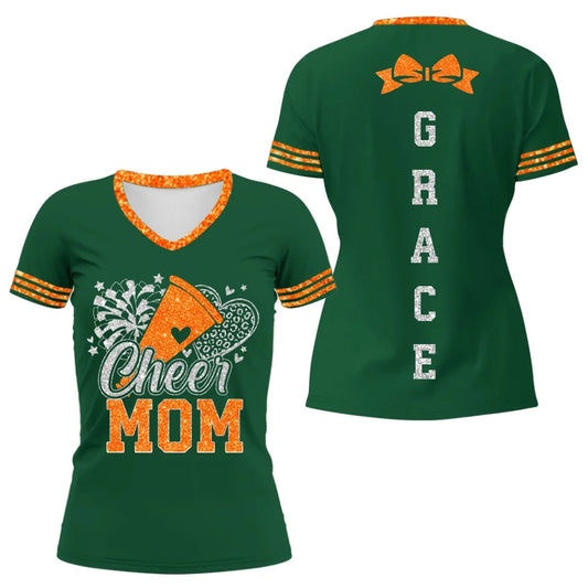 Personalized Glitter Cheer Mom Printed V-Neck T-Shirt with Name