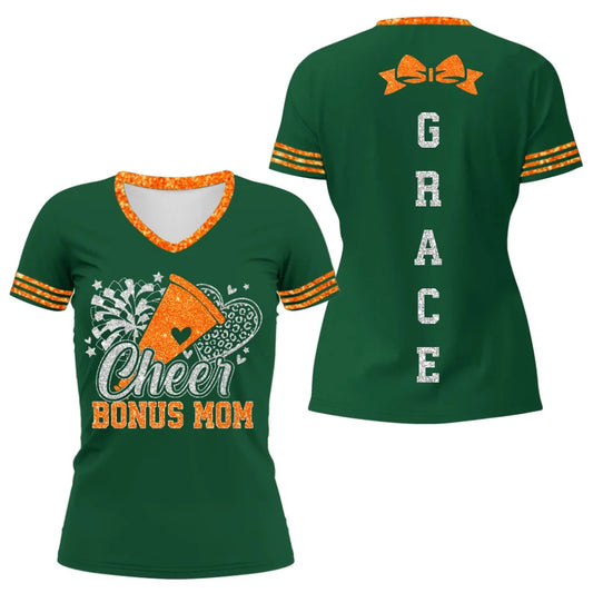 Personalized Glitter Cheer Bonus Mom Printed V-Neck T-Shirt