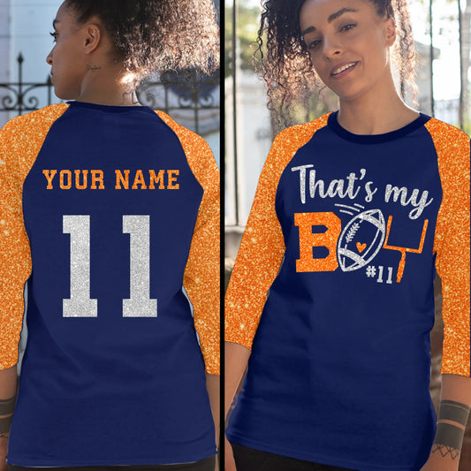 Personalized Glitter That's My Boy Football Mom 3/4 Sleeve Raglan T-Shirt
