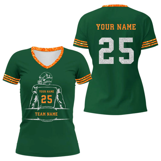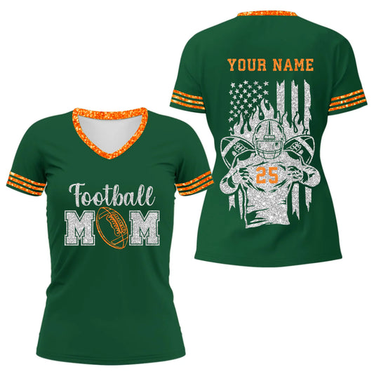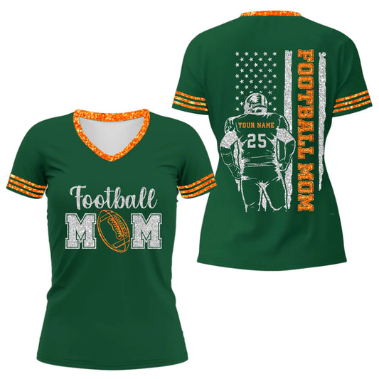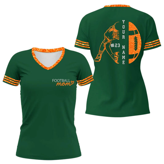 Personalized Glitter Football Mom Women V-Neck T-Shirt