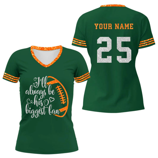 Personalized Glitter I'll Always Be His Biggest Fan Football Mom V-Neck T-Shirt