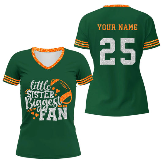Personalized Glitter Football Sister Little Sister Biggest Fan V-Neck T-Shirt