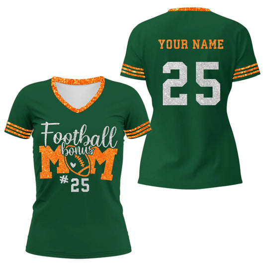 Personalized Glitter Football Bonus Mom Women V-Neck T-Shirt