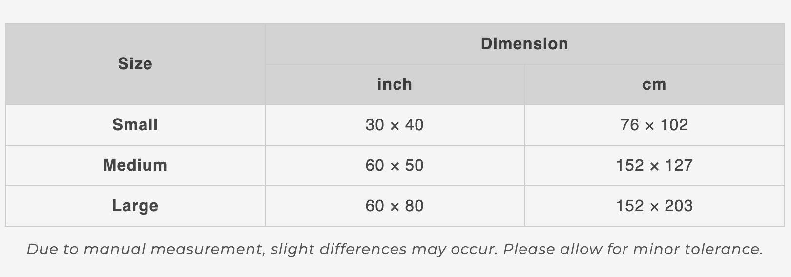 Available sizes: 30in x 40 in, 50in x 60 in, 60in x 80 in